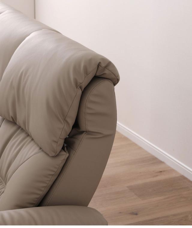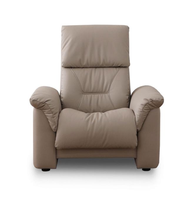 体重移動だけでリクライニングが出来るソファです。座面裏のポールを回してリクライニングの堅さを調整することが可能です。ヘッド部も6段階に角度調整が可能。プロテクトファイブレザーを使用しているので従来の合成皮革よりも耐用性があります。座面中央のくぼみと絶妙な弾力性が身体を包み込んでフィットします。分解搬入可能です。