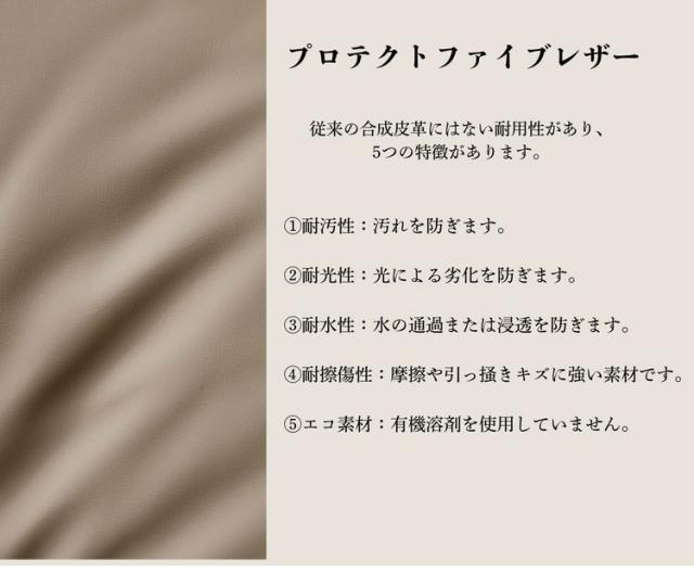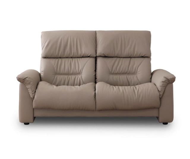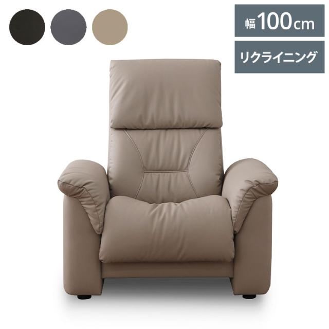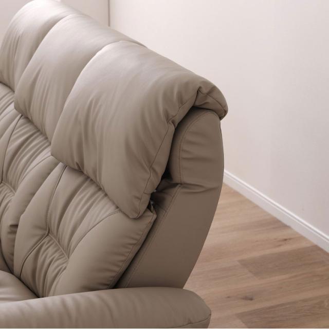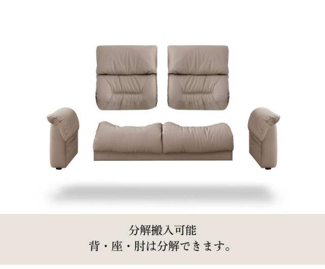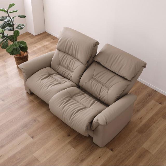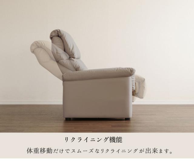 体重移動だけでリクライニングが出来るソファです。座面裏のポールを回してリクライニングの堅さを調整することが可能です。ヘッド部も6段階に角度調整が可能。プロテクトファイブレザーを使用しているので従来の合成皮革よりも耐用性があります。座面中央のくぼみと絶妙な弾力性が身体を包み込んでフィットします。分解搬入可能です。