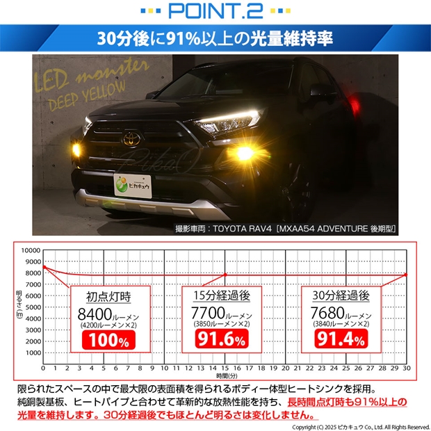 明るさ全光束8400ルーメンの最強のモンスターフォグランプLEDバルブです。放熱性能が高いため、長時間点灯後も91%以上の光量を維持します。30分経過後もほとんど明るさが変化しない放熱対策を施しています。純正球の配光特性に徹底的にこだわり、理想的な配光を実現しています。