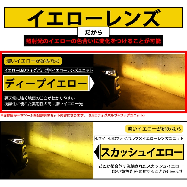 イエローレンズにLEDイエロー光を通すのでフォグの照射光は「濃いイエロー光=DEEP YELLOW」になります。イエローレンズなので非点灯時も抜群のアピール性を発揮します。