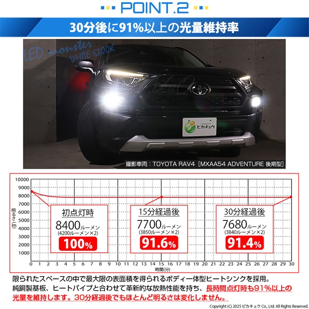 明るさ全光束8400ルーメンの最強のモンスターフォグランプLEDバルブです。放熱性能が高いため、長時間点灯後も91%以上の光量を維持します。30分経過後もほとんど明るさが変化しない放熱対策を施しています。純正球の配光特性に徹底的にこだわり、理想的な配光を実現しています。