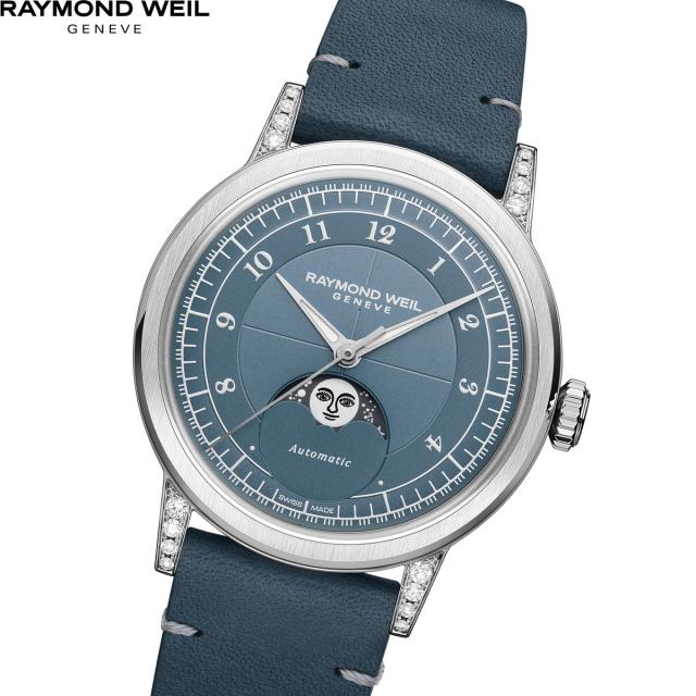 ステンレススティールの直径35mmケースに、仕上げの美しさが際立つデニムブルーのセクターダイアルを搭載した「ミレジム」のムーンフェイズ表示付きモデル。小ぶりのダイアルでも時間を読み取りやすいアラビア数字のインデックスを採用。ダイアル6時位置のムーンフェイズ表示では、月が描かれた回転ディスクで月の満ち欠けを示します。にっこりと笑った表情が印象的な月の顔「ハッピースマイリングムーンフェイズ」は、職人が1点ずつ手作業で描きあげたレトロ感溢れるデザインであるとともに、時計を見た人にも幸せな気分になってほしいという願いが込められています。【レイモンド・ウェイル RAYMOND WEIL】