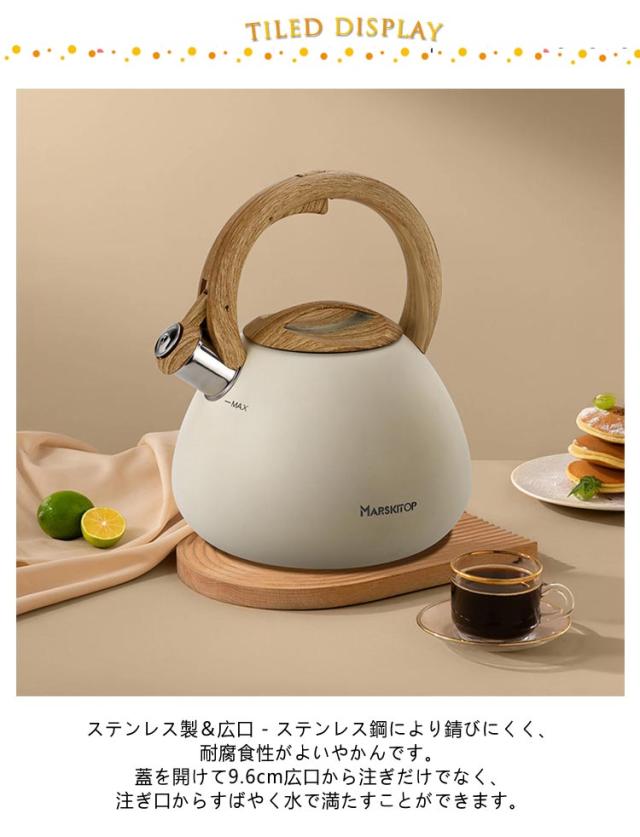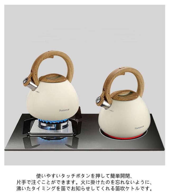 | お湯が沸いたら笛吹で教えてくれる笛吹ケトルです。【グラデーションカラーあり】 ステンレス製&広口 - ステンレス鋼により錆びにくく、耐腐食性がよいやかんです。蓋を開けて9.6cm広口から注ぎだけでなく、注ぎ口からすばやく水で満たすことができます。 タッチボタン&笛吹き - お湯を簡単かつ安全に注ぐために固定耐熱ハンドルを採用、やけどを避けてハンドルを素手で掴むことができます。使いやすいタッチボタンを押して簡単開閉、片手で注ぐことができます。火に掛けたのを忘れないように、沸いたタイミングを笛でお知らせしてくれる笛吹ケトルです。仕事、家事、映画やゲームなどに集中する時、お湯が沸くと大きい音で知らせてくれます。効率アップで時間節約できます。 急速湯沸し&オール熱源対応 - 広いベースを使用、やけんの熱効率をより高められ、沸騰時間を短縮することができる。ガス火、直火はもちろん、IH、ハロゲンヒーター、ラジエントヒーターなど熱源に対応します。沸騰中は熱くなっているので、取っ手には触れないでください。 やけどをしないように、蓋は冷めて後で開けてください。 オシャレなデザイン&大容量 - かわいいとおしゃれな高級ヤカンは、キッチンの雰囲気作りも楽しみたいという人におすすめです。パーティ、ティータイムや毎日のクッキングでも大活躍です。2.5L大容量で、一度に家族全員分のお湯が作れます。お茶を淹れたり、麦茶などの煮出しの際にたくさん作れて便利です。 | |
