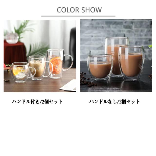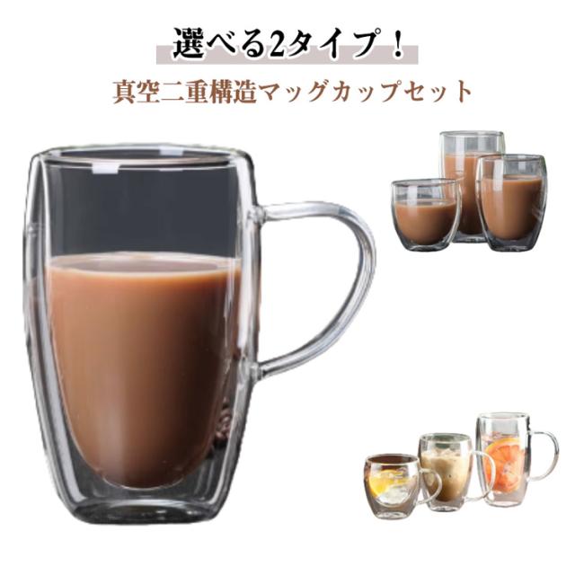 | 選べる2タイプ!真空二重構造マッグカップセット 2重耐熱ガラスで作られているので熱いものは熱く、冷たいものは冷たく保つことが出来、どの季節どのシーンでも活躍します。 ハンドルつき、耐熱ガラス製マグのお洒落さはそのままに「持った時の熱さ」を解消しています。 お茶、コーヒー、ミルク、飲酒、飲料などホットでもアイスでもお楽しみ頂けます!家族と友達へのプレゼントにも特にお勧め! | |