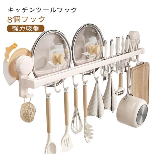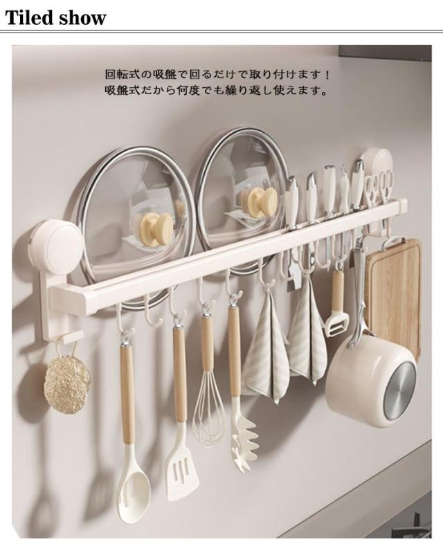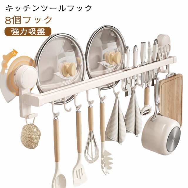 | キッチンツールフック 8個フック 強力吸盤 可動式フック ダブルバー 包丁差し付き 回転式の吸盤で回るだけで取り付けます!吸盤式だから何度でも繰り返し使えます。 キッチンルーツや包丁、キッチンバサミ、鍋蓋、まな板などをまとめて収納できます。 メッキを施すことでサビに強いです。 キッチンやバスルームの壁面に穴あけ不要で設置でき、壁に痕が残らないのも魅力です。 | |