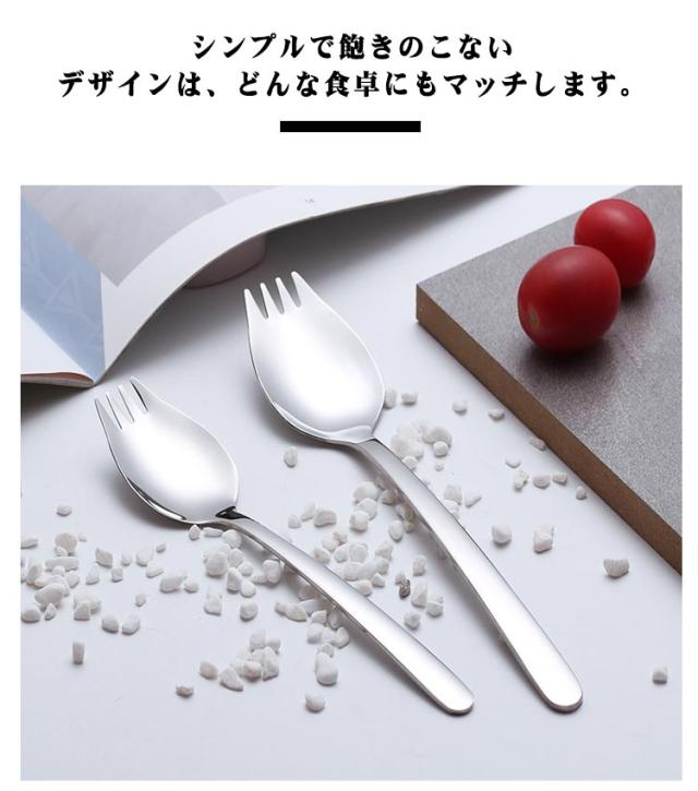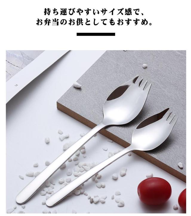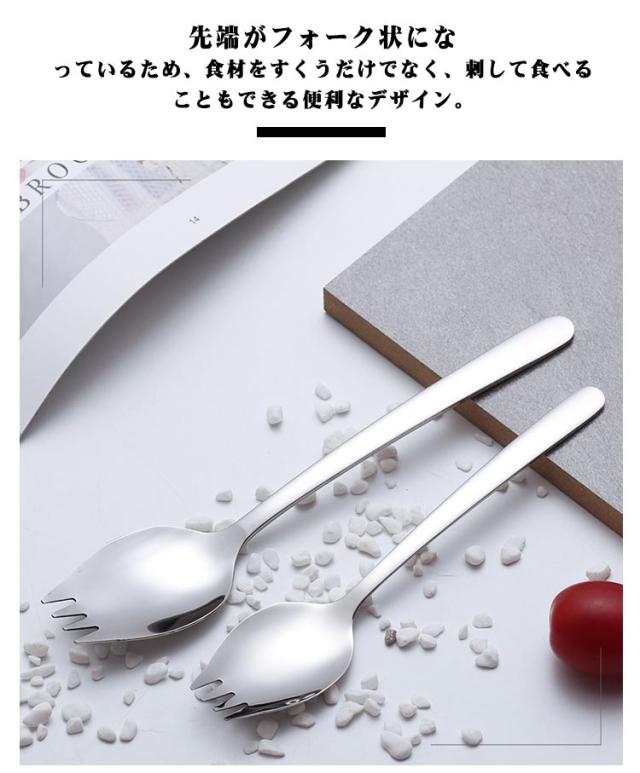 | カレーやサラダ、お弁当など様々なシーンで大活躍する万能アイテムです。 先端がフォーク状になっているため、食材をすくうだけでなく、刺して食べることもできる便利なデザイン。 丈夫で錆びにくいステンレス製なので、家庭用はもちろん、業務用や学生さんの通学用にも最適です。 シンプルで飽きのこないデザインは、どんな食卓にもマッチします。 持ち運びやすいサイズ感で、お弁当のお供としてもおすすめ。 | |