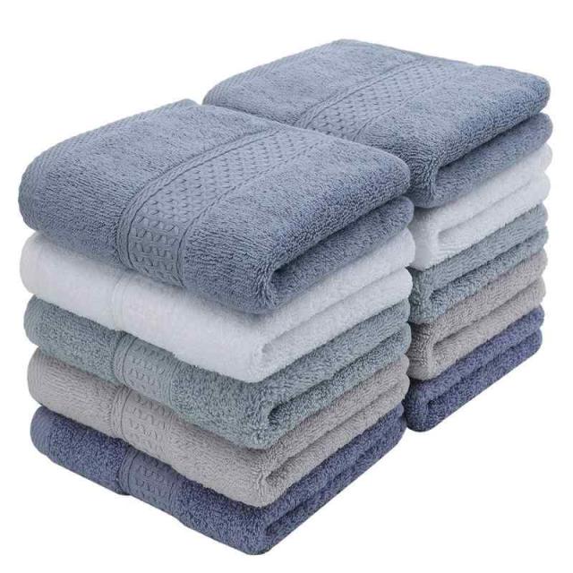 【フェイスタオル 10枚セット】素材:綿100%、サイズ:約33×74cm、重さ:約100g(1枚)、セット内容: グレー 2枚 、ダークブルー 2枚、ライトブルー2枚、ホワイト2枚、パープル2枚。