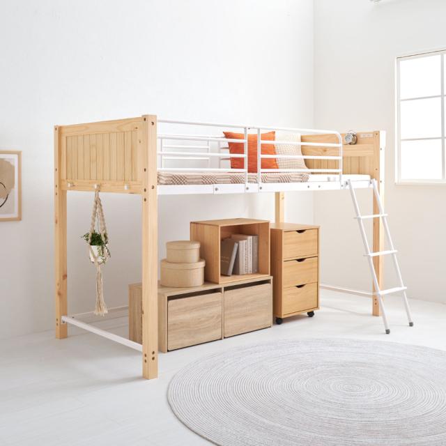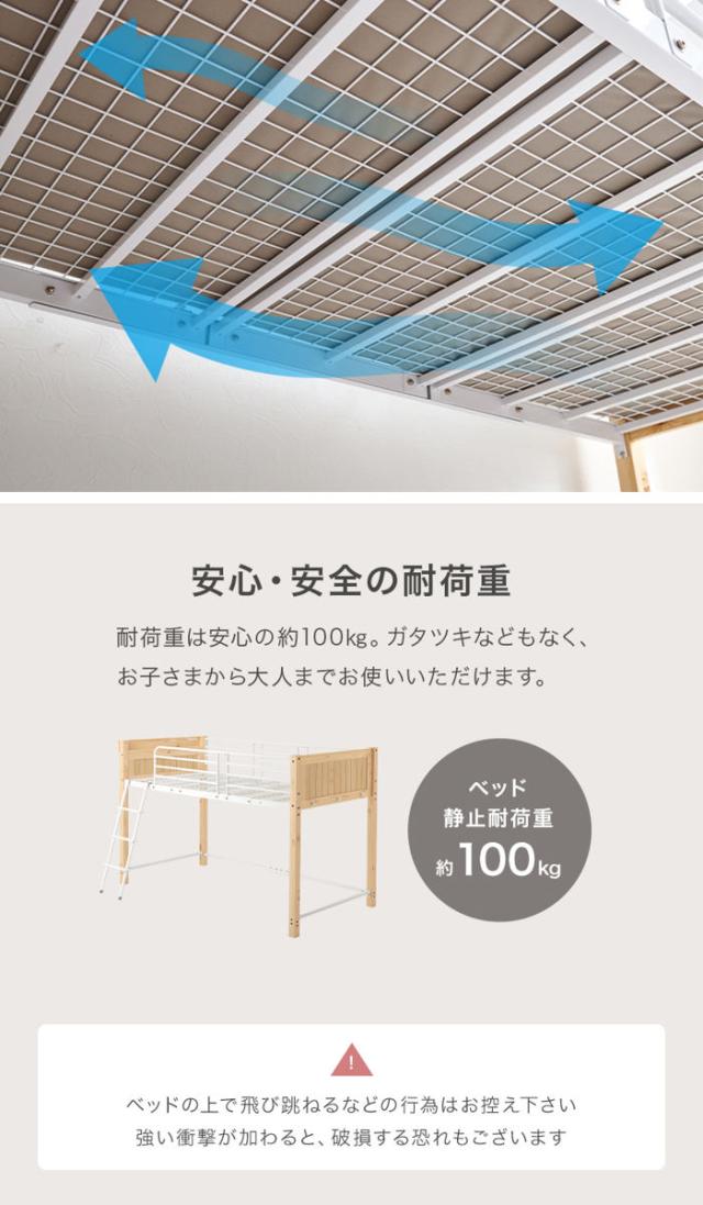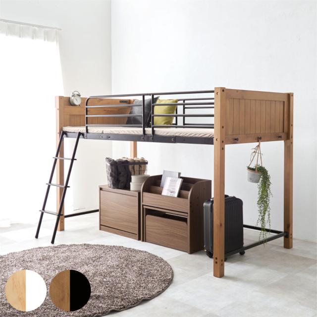 ロフトベッド 天然木×スチール ロータイプ シングル 宮棚 2口コンセント付 ( ベッド ロフト 木製 コンセント付 フック付 省スペース シングルベッド 収納スペース ハシゴ 耐荷重100kg メッシュ )
