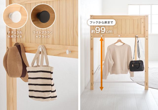 フッドボードには便利なフックが3つ。普段使いの帽子やバッグを掛けたり、次の日に着るお洋服を掛けておけるので、お出かけの準備がスムーズです。