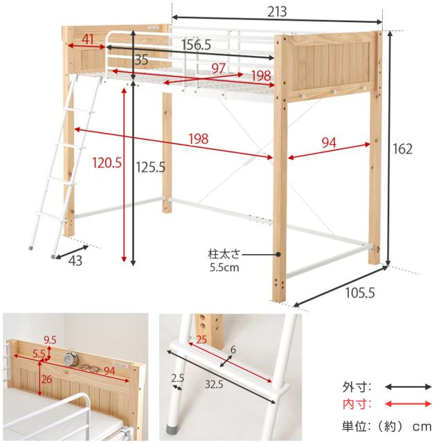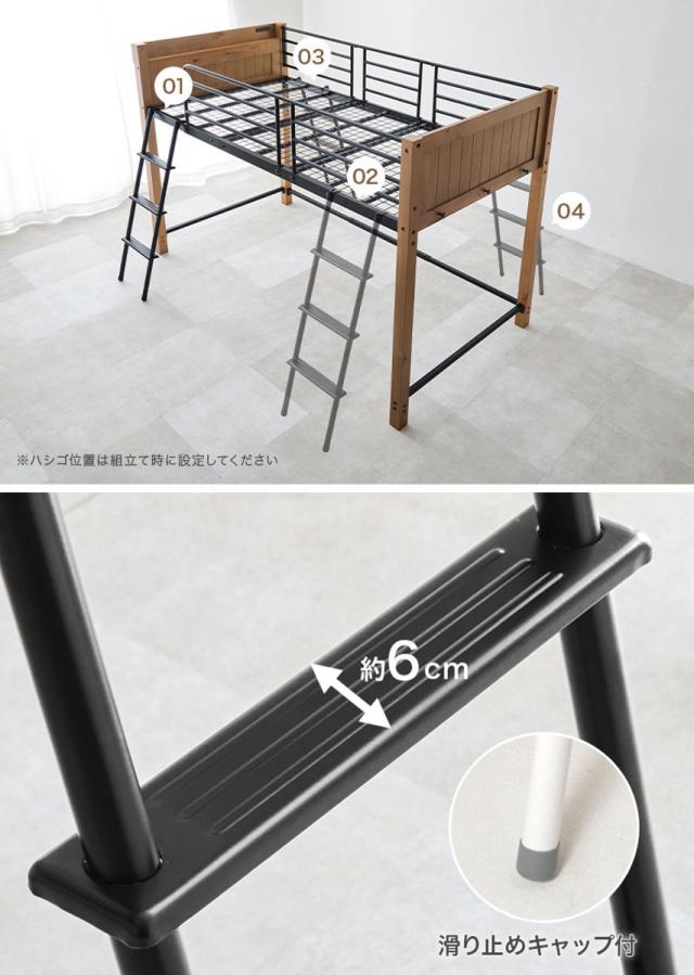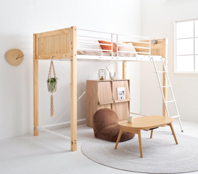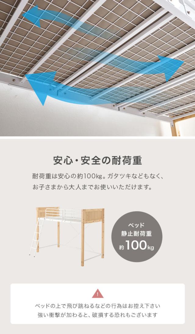ロフトベッド 天然木×スチール ハイタイプ シングル 宮棚 2口コンセント付 ( ベッド ロフト 木製 コンセント付 フック付 省スペース シングルベッド 収納スペース ハシゴ 耐荷重100kg メッシュ )