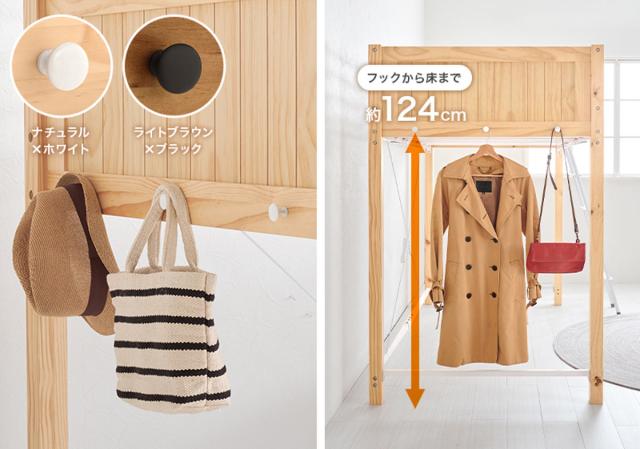 フッドボードには便利なフックが3つ。普段使いの帽子やバッグを掛けたり、次の日に着るお洋服を掛けておけるので、お出かけの準備がスムーズです。