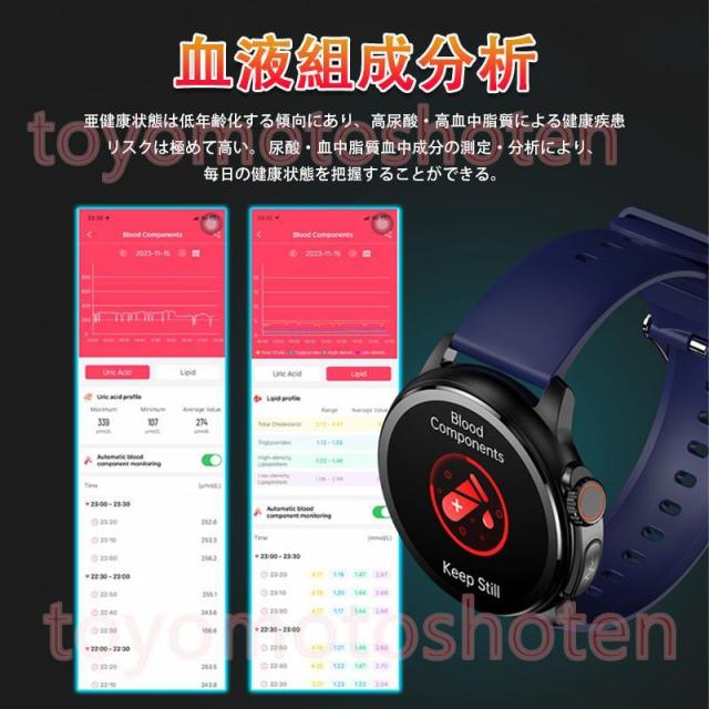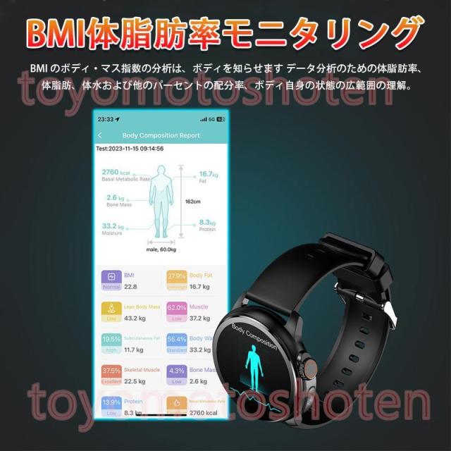 2025最新 スマートウォッ「体組成 血液成分分析」ECG心電図 通話可能 血圧測定 音楽 体温 血中酸素 心拍数 睡眠管理 常時点灯 アンドロイド対応