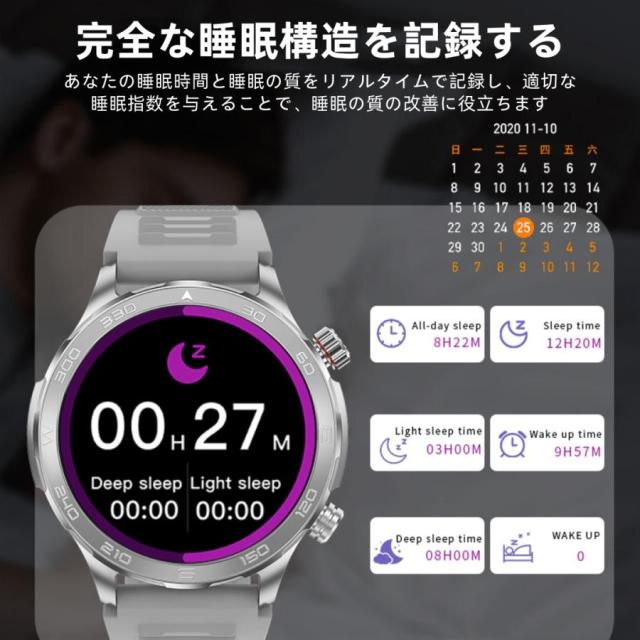また、睡眠モニタリング機能も搭載しており、睡眠の質(深い睡眠、浅い睡眠、レム睡眠)を科学的に記録し、アプリから自分の睡眠質を把握でき、評価し、良い睡眠習慣を身につけるのに役立つ。