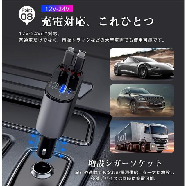 シガーソケット 最新発売 カーチャージャー 車載 充電ケーブル 充電器 3in1 リール式 スマホ充電 限定セール 急速充電 シガーチャージャー 伸縮ケーブル USB充電