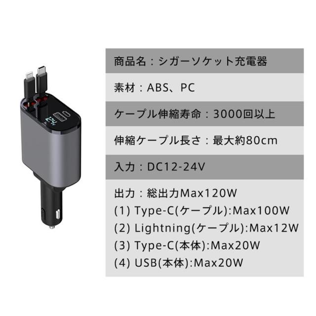 シガーソケット カーチャージャー 車載 充電ケーブル 充電器 3in1 リール式 スマホ充電 急速充電 シガーチャージャー 伸縮ケーブル USB充電