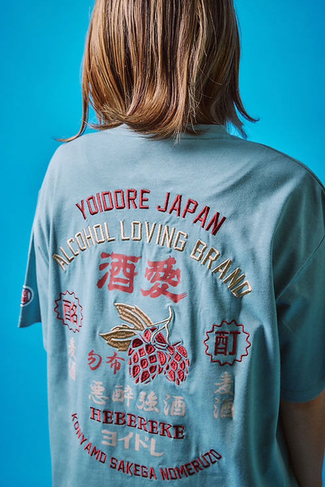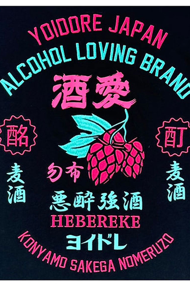 乾杯のビールにリスペクトを捧ぐべく、バックはそんなビールの原料であるホップをガッツリ刺繍でセンターに配置し、ヴィンテージな雰囲気のアーチロゴでYOIDOREの世界観を表現しました。