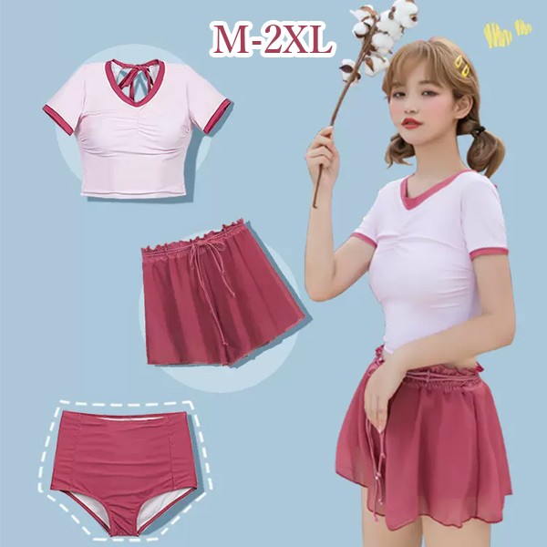 タンキニ水着 服みたいな レディース 3点セット 無地 リボン 半袖 ワイヤーなし パッド付 ラウンドネック 着?せ シンプル セクシー 写真映え 撮影用 海 夏 サマー プール リゾート かわいい 旅行 温泉 大人 女性用 ジュニア 学生 女の子 ママ水着 レッド df442m4m4ld