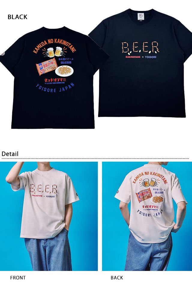 すべての酔いどれに届ける、酔いどれのためのブランド「YOIDORE」より「柿の種コラボ半袖Tシャツ(825629)」が入荷してまいりました。 誰もが知る究極のおつまみ! おつまみ界を代表する「GOOD おつまみ」亀田製菓の【亀田の柿の種】と【YOIDORE】の奇跡のコラボレーションが実現しました! フロントのBEERロゴは柿の種を並べて形作られた秀逸なデザインを刺繍で立体的に表現。 バックは柿の種カラーのアーチロゴ刺繍とプリントイラストのMIXでヴィンテージな雰囲気むんむん! パッと見ただけで誰もがクギ付けになること間違いなしの存在感溢れる傑作に仕上がっています。 柿の種の普遍的な親しみとYOIDOREの世界観が見事にマッチしたスペシャルなコラボアイテムです。 ややゆったりめのルーズなシルエットは適度なリラックス感があり、ラフな呑みシーンでのコーディネートに取り入れたいマストなアイテムです。 全ての商品にシーズン毎にデザインが変わる限定ステッカー付きです。 | ||||||||||||||||||||