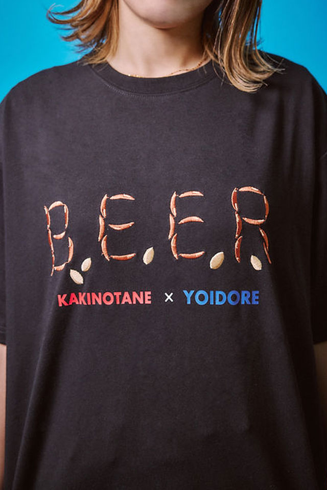 フロントのBEERロゴは柿の種を並べて形作られた秀逸なデザインを刺繍で立体的に表現。