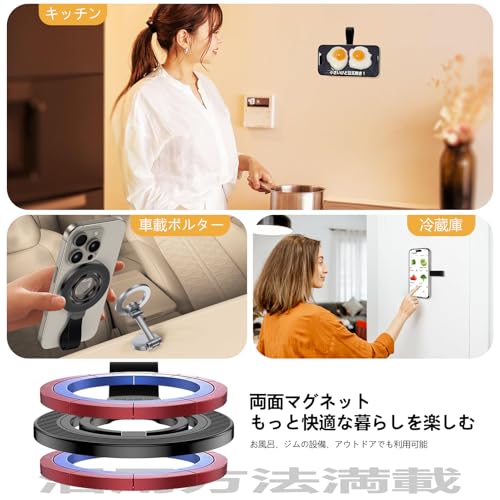 【ユーザーに大人気・両面マグネット機能】弊社の製品は、その両面マグネット機能がユーザーに大変好評をいただいており、MagStand Proでも同様の機能を引き継いでいます。お客様は両面磁気吸着機能を使用して、車載ホルダーや冷蔵庫、洗濯機、ジムの設備など、磁力のあるものに製品を取り付けることができます。また、キッチンやお風呂の壁など磁力のないものには、付属のメタルリングを貼り付けることで磁力を持たせることも可能です。この両面マグネットで、いつでもどこでも両手を解放して、TikTok、Ins