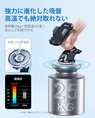 【耐荷重25KG、安定性抜群】が新開発した特殊粘着ゲル吸盤は強力な吸着力と高温でもヘタらない耐久力を実現できました。4層構造の強力ゲル吸盤は「耐荷重25KG」で人気他社製品より、吸着力が高くなり、エンジンの振動やデコボコ道でも取れる心配はありません。