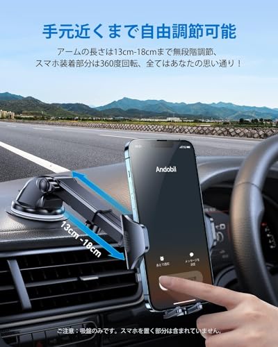 【伸縮ロングアーム・手元まで近い】車 スマホスタンドのロングアームの長さは130mmから220mmまで調整可能で、運転中にスマホを手元近くまで操作できます。 アームの角度が最大270度まで無段階調節でき、吸盤式ホルダーとしても全然視野を邪魔しません。