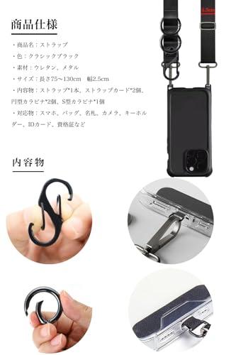 【商品仕様】・商品名:ストラップ ・サイズ:長さ75〜130cm 幅2.5cm ・ストラップ×1本、ストラップカード×2個、円型カラビナ×2個、S型カラビナ×1個 ・対応物:SMART PHONE スマートフォン 各種、バッグ、名札、カメラ、キーホルダー、IDカード、資格証など