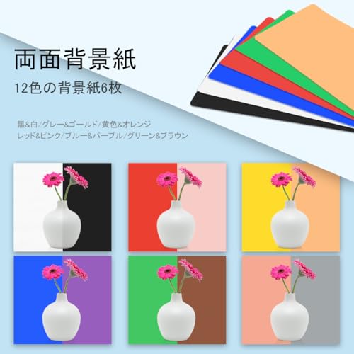 【12色のコート背景シート】完璧な撮影環境を提供するために、撮影キットにはコート材質のバックスクリーンが12色(黒/白・青/紫・緑/茶色・赤/ピンク・黄色/オレンジ・グレー/ローズゴールド)付属、撮影の対象品にお応じて、ご自由に背景色を切り替えられることができます。6枚のコート背景紙、両側で合計12色が付属しています!背景紙のコート材質で、丸めて保管でき、持ち運びができ、場所を取らず、シワになりにくく、汚れや埃を拭き取ることができます。