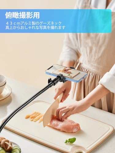 [様々な場面で利用できる]子供の運動会、発表会、写真撮影、動画鑑賞、ライブ配信、旅行、登山などのシーンで活用します。より長いフレキシブルアームなので、真上から料理、絵画、DIYなどの写真が撮れます。それに、床