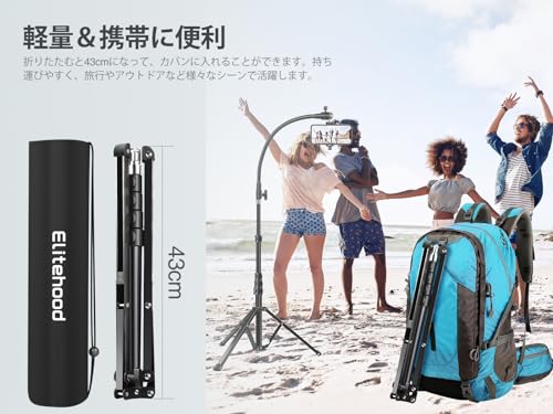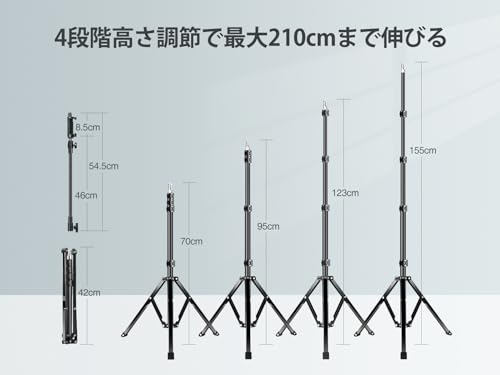 [4段階で高さ調整可能] iphone 三脚 は4段階高さ調節で最大210cmまで伸びます。より高いスタンドは人混みでも気軽に動画や写真をはっきり撮影することができます。レバーロック式の脚を採用しており、ロックを解除するだけで素早く脚の伸縮が可能です。気軽に高さを調整することができます。