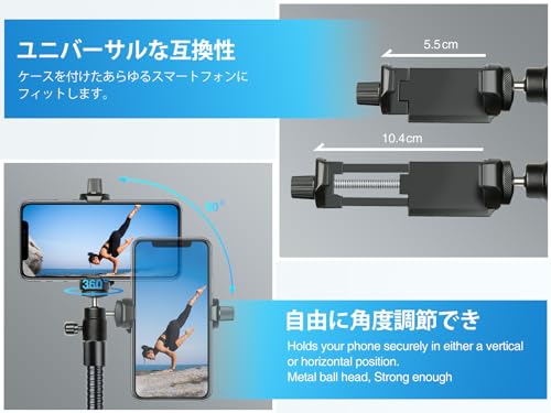 [360度回転]三脚スタンドの先端部は自由に曲げられるアーム付きで、360度回転で画面を縦向きにも横向きにも固定でき、最適な傾斜角度に傾けるとができます。撮りにくい角度からの自撮りや大人数の集合写真などのシーンにも対応できます。