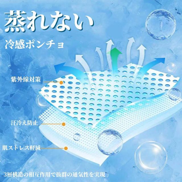 ■【瞬間冷却、冷感ポンチョ】水に濡らして絞って振ることで冷却効果を発揮するクーリングポンチョ。接触冷感で暑い時もひんやり!頭部と全身をカバーするフード付きのポンチョ形状としたことで、全身を快適に冷やすことができます。