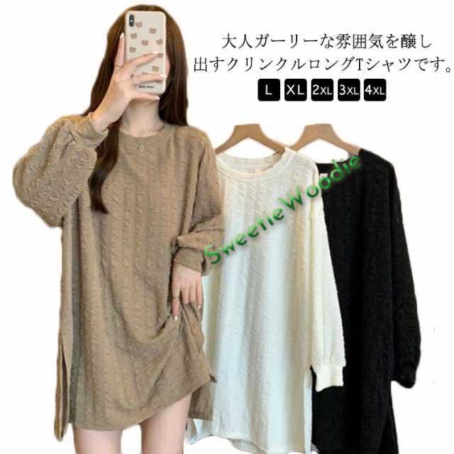 クリンクル ロングtシャツ tシャツ レディース 長袖 チュニック ラウンドネック カットソー ロング丈 Tシャツ 長袖 ロングtシャツ プルオーバー トップス 着痩せ 体型カバー カジュアル シンプル L XL 2XL 3XL 4XL
