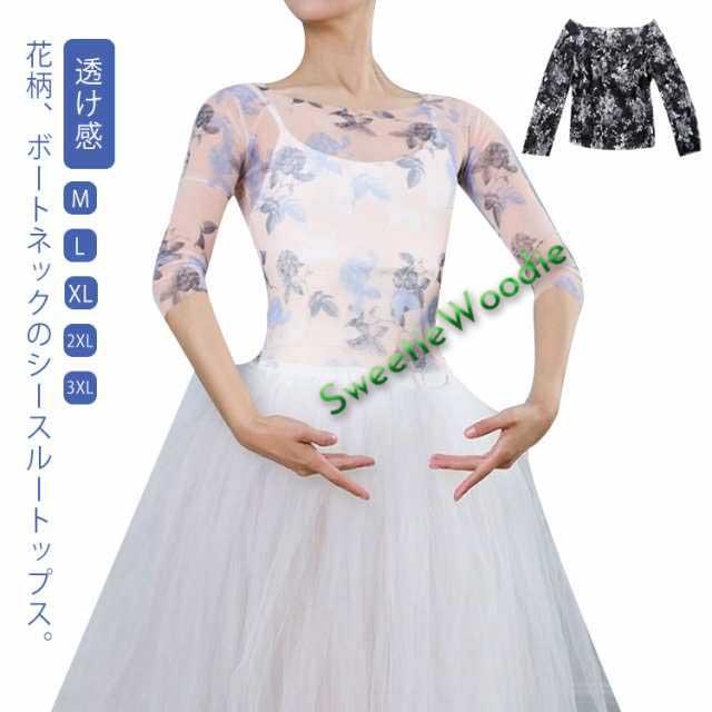 バレエ トップス 大人 花柄 ボートネック メッシュ バレエトップス レディース シアートップス 七分袖 シースルー トップス 透け感 ダンス レッスン 練習着 ストレッチ ダンス衣装 レイヤードトップス メロウ 20代 30代 40代