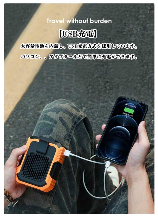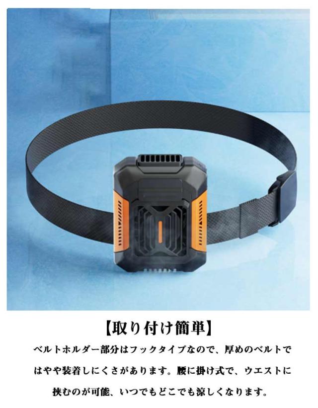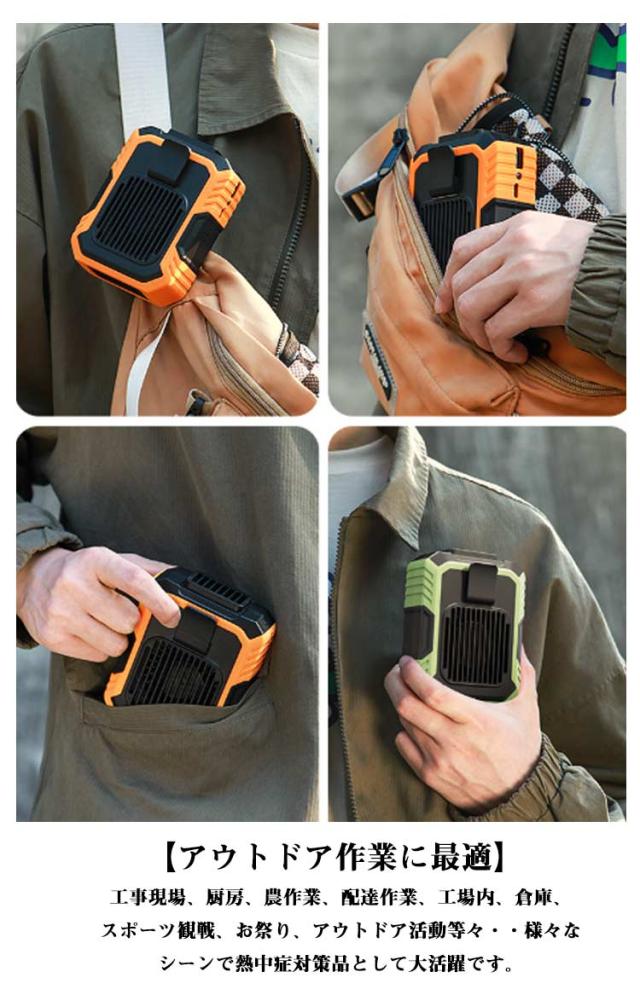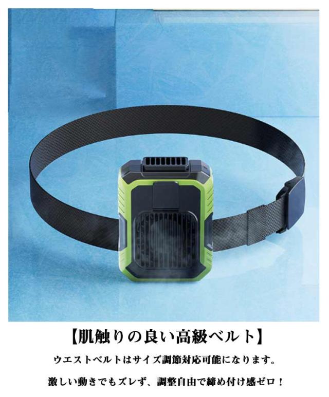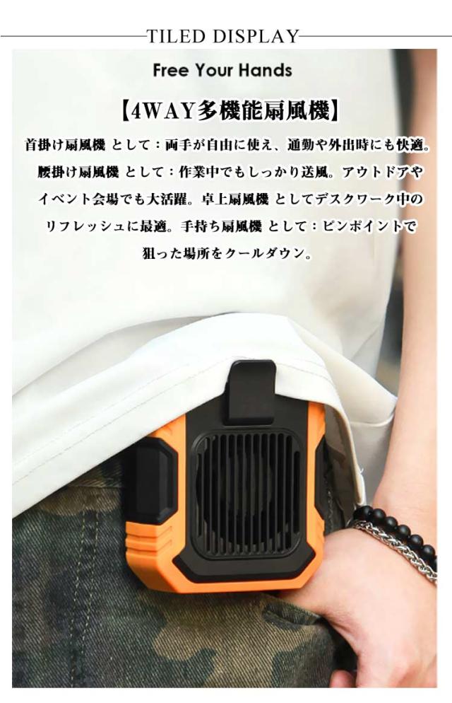 | 【4WAY多機能扇風機】首掛け扇風機 として:両手が自由に使え、通勤や外出時にも快適。腰掛け扇風機 として:作業中でもしっかり送風。アウトドアやイベント会場でも大活躍。卓上扇風機 としてデスクワーク中のリフレッシュに最適。手持ち扇風機 として:ピンポイントで狙った場所をクールダウン。 【3段階風量調整】自然に近い弱風から強風まで3段階の風量調節が可能で、気温に合わせて自由に調節できます。 【懐中電灯機能】LED照明用ランプが付いてあり暗い場所での作業、緊急時などの照明になります。外出先、キャンペン場でスマホを充電可能で、一台で懐中電灯、、扇風機の機能があり、もっと便利になります。 【肌触りの良い高級ベルト】ウエストベルトはサイズ調節対応可能になります。激しい動きでもズレず、調整自由で締め付け感ゼロ! 【取り付け簡単】ベルトホルダー部分はフックタイプなので、厚めのベルトではやや装着しにくさがあります。腰に掛け式で、ウエストに挟むのが可能、いつでもどこでも涼しくなります。 【USB充電】大容量電池を内蔵し、USB充電方式を採用しています。パソコン、、アダプターなどで簡単に充電ができます。 【アウトドア作業に最適】工事現場、厨房、農作業、配達作業、工場内、倉庫、スポーツ観戦、お祭り、アウトドア活動等々・・様々なシーンで熱中症対策品として大活躍です。 | |