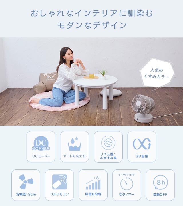 | 機能 | お手入れ簡単ガード、上下左右3D立体首振り、3枚羽根、風量8段階、切りタイマー7時間、切り忘れ防止8時間自動オフタイマー、リズム風、おやすみ風、リモコン付き、フルリモコン対応、適応畳数18畳、組立不要完成品 |