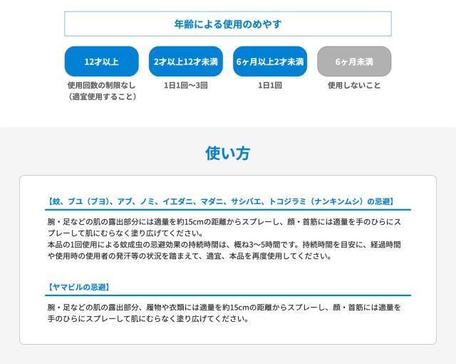 腕・足などの肌の露出部分には適量を約15cmの距離からスプレーし、顔・首筋には適量を手のひらにスプレーして肌にむらなく塗り広げてください。本品の1回使用による蚊成虫の忌避効果の持続時間は、概ね3〜5時間です。持続時間を目安に、経過時間や使用時の使用者の発汗等の状況を踏まえて、適宜、本品を再度使用してください。