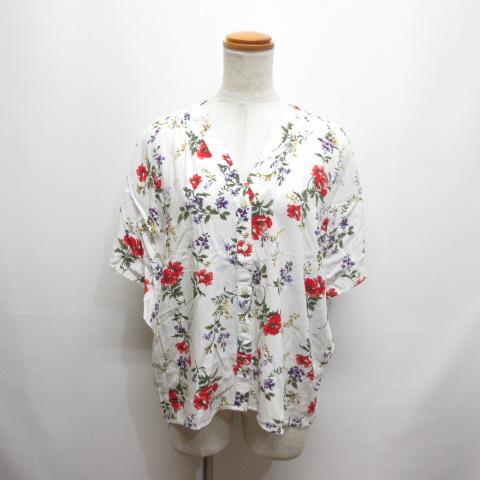 【中古】グローバルワーク GLOBAL WORK 花柄 Vネック 半袖 レーヨン ブラウス シャツ M ホワイト バタフライスリーブ