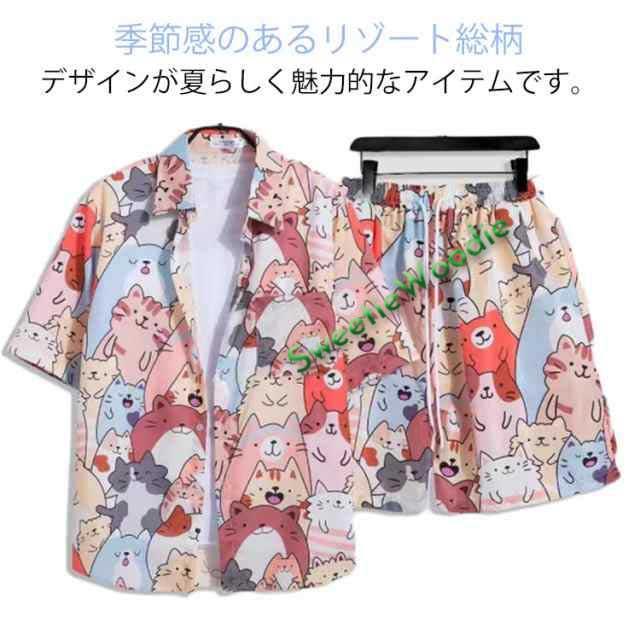 猫 トップス シャツ アロハ メンズ 半ズボン 半ズボン 2点セット 薄手 ショートパンツ 着痩せ プリント ネコ 猫 ゆったり カジュアル セットアップ おしゃれ 大きいサイズ 可愛い 海 五分袖