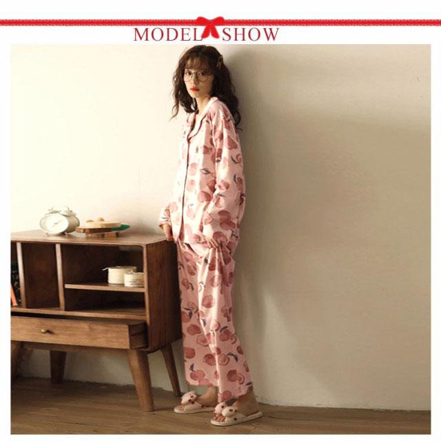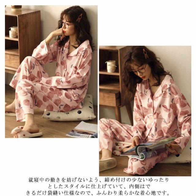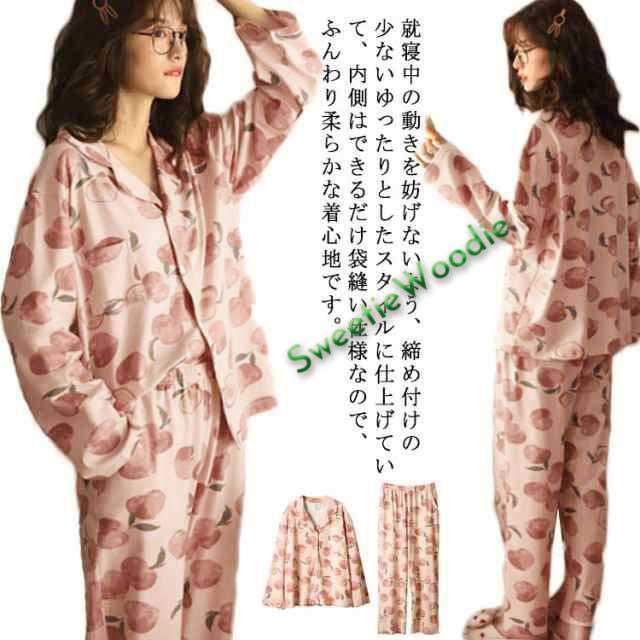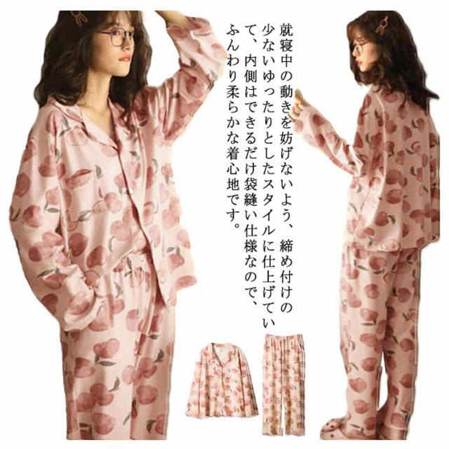 レディース パジャマ 前開き 桃 もも柄 上下セット ルームウェア 春夏秋 部屋着 ルームウエア 長袖 ナイトウェア 女性 寝間着 シャツパジャマ おしゃれ セットアップ 寝巻き
