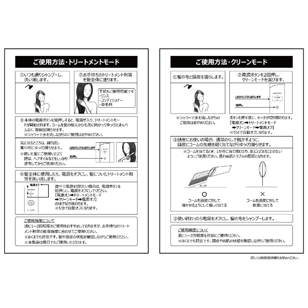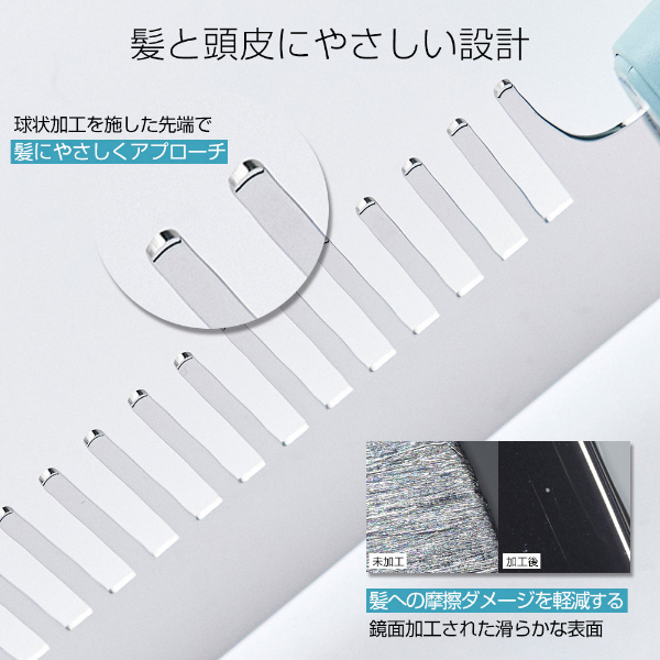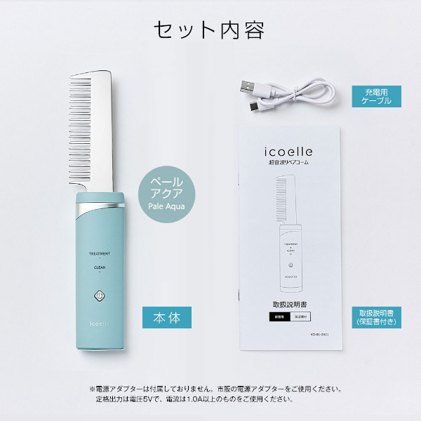 【セット内容】本体×1、充電用ケーブル×1、取扱説明書(保証書付き)【本体サイズ(約)】W52×D247×H20mm/約108g【カラー】ペールアクア【材質】●コーム:ステンレス●ハンドル:ABS樹脂、シリコーン【保証期間】お買い上げ日から1年間、保証は本体のみ適応されます。(充電池は消耗品のため保証対象外)。保証の詳細は取扱説明書(保証書付き)をご確認ください。【商品仕様】[電源]充電式(リチウムイオン電池内蔵 500mAh/3.7V)[定格消費電力]最大2W[充電時間]約180分(※充電時間は付属の充電用ケーブルで充電した際の目安です)[電池持続時間]約75分 (1モード5分を15回使用)※メーカー推奨の使用方法に準じます。実際の時間は、使用環境や使用状況により異なります。