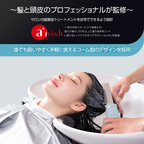 髪と頭皮のプロフェッショナル、ヘアサロン「apish」監修!自宅で手軽にサロン級のケアを叶えるアイテムです。注目したのは、プロの現場でも使われる「超音波トリートメント」。独自の超音波振動がトリートメント剤を微細化し、髪の内部までしっかりと浸透をサポートします。搭載された2つのモードで、髪のうるおい補給サポートと頭皮の汚れケアの両方に対応。使い方は簡単、ただ梳かすだけ。先端には球状加工、表面には鏡面仕上げを施し、髪への摩擦ダメージをやさしく軽減。コードレス&軽量で持ち運びにも便利です。【電源アダプター】●電源アダプターは付属しておりません。市販の電源アダプターをご使用ください。定格出力は電圧5Vで、電流は1.0A以上のものをご使用ください。●急速充電のアダプターには対応しておりません。製品の性能に影響があるおそれがあるので、ご使用はお控えください。●パソコンのUSBポート等からの充電はお止めください。【製造国】中国【販売者】株式会社ジヴァスタジオ