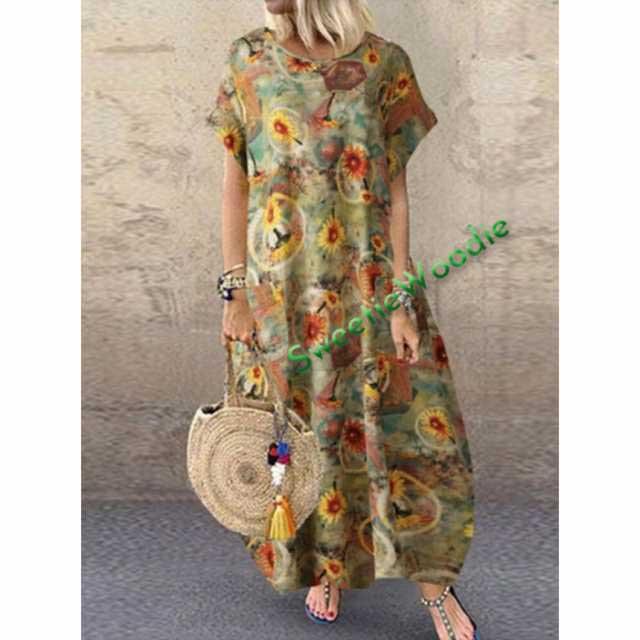 ワンピース ポッケト レディース ロングワンピース マキシワンピース エスニックワンピース 半袖 総柄 花柄 体型カバー きれいめ ゆったり 大人