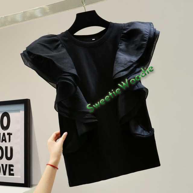 シフォン レイヤードフリルブラウス ブラウス 袖フリル ノースリーブ フリル トップス レディース クールネック 着痩せ カジュアル 通勤 OL ゆったり 体型カバー 大人 韓国 ファッション 同窓会 結婚式 パーティー フレンチスリーブ 半袖 送料無料