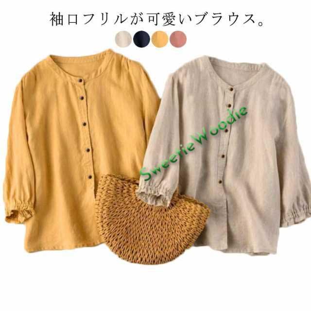 リネン レディース トップス 春夏 ブラウス ブラウス リネンブラウス 綿麻 ナチュラル スタンドカラー シャツ フリル袖 七分袖 キレイめ 無地 おしゃれ ゆったり かわいい 大きいサイズ