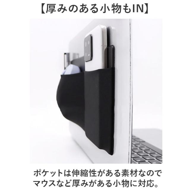 | 商品説明 | 【周辺機器をまとめてIN】 ・ノートパソコンに貼り付けて使える♪ガジェットケースが新発売。 【マウスやコードを入れるのに】 ・ノートパソコンに接続するコードやマウスなどまとめて入れて収納可能。 【厚みのある小物もIN】 ・ポケットは伸縮性がある素材なのでマウスなど厚みがある小物に対応。 【持ち運び&設置しやすい薄さ】 ・薄手でデスクの上やカバンの中に入れても干渉しない作りなのも嬉しいポイント☆ 【貼り付け簡単】 ・裏面の粘着シールでお手持ちのノートパソコンにペタッと貼り付けるだけで設置完了。 【シーン問わず使える】 ・装飾がないオールブラックカラーで、ビジネスシーンにも使える。 【ポケット仕様】 ・オープンポケット×3 |