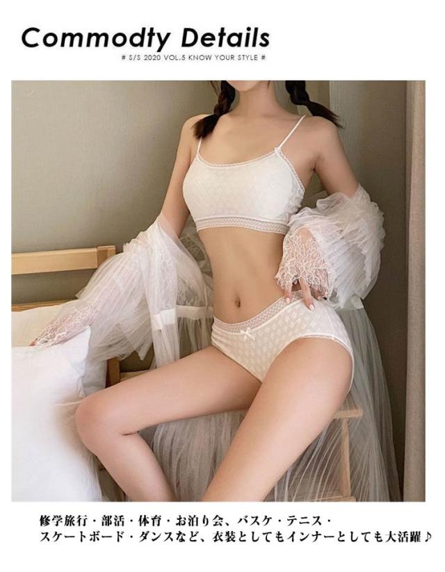 | キュートなスポーツブラとショーツの上下セット ブラは、大きくなり始めたバストを優しくホールドカバー、デイリー使いにぴったり 上下お揃いのショーツもセットになっています。使いやすくて安い定番カラーをご用意。 修学旅行・部活・体育・お泊り会、バスケ・テニス・スケートボード・ダンスなど、衣装としてもインナーとしても大活躍♪ | |