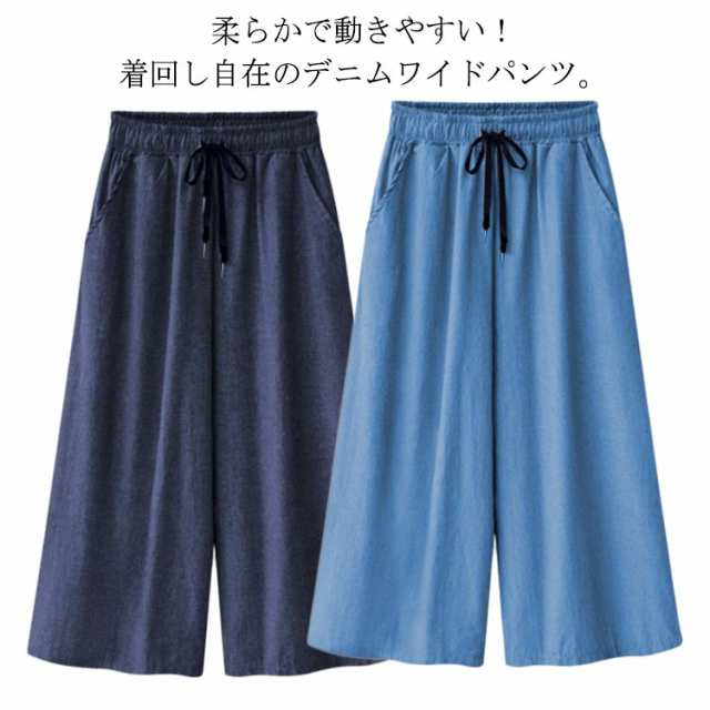 ガウチョパンツ レディース 涼しい ウェストゴム イージーパンツ ポケット付き デニムパンツ ハイウェスト 夏 ワイドパンツ 薄手 ゆるパンツ カジュアル 7分丈