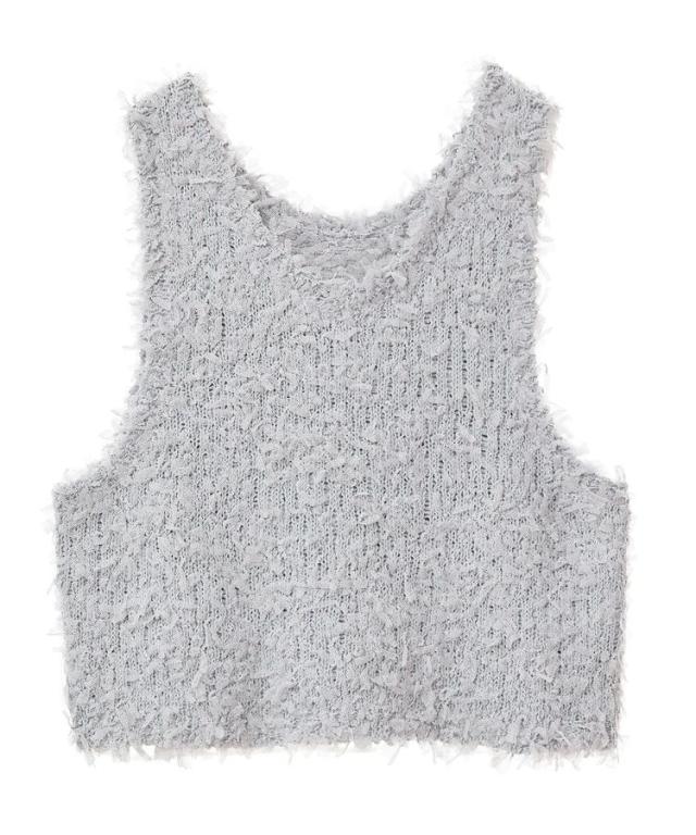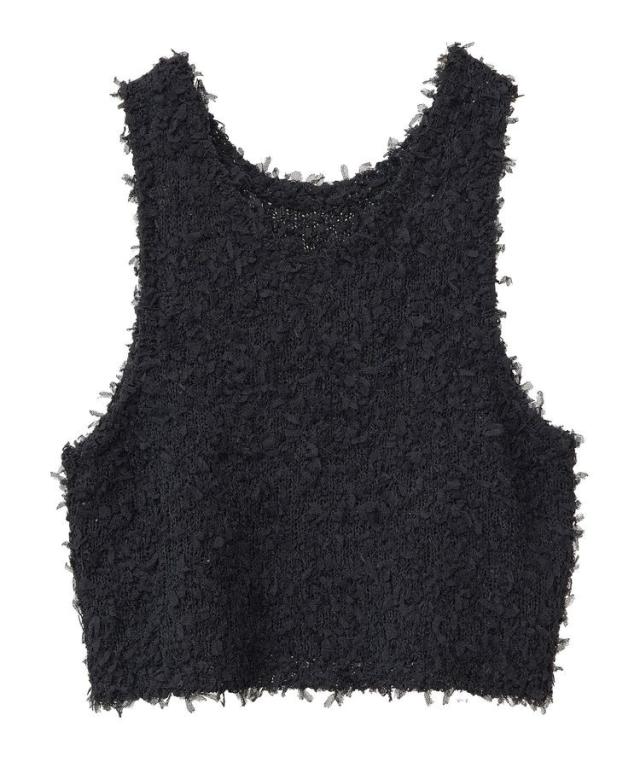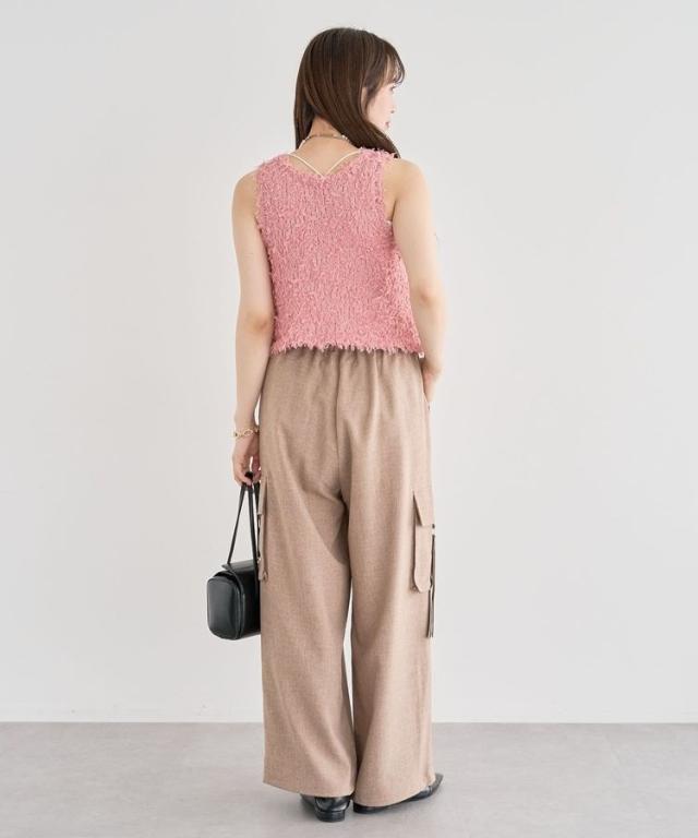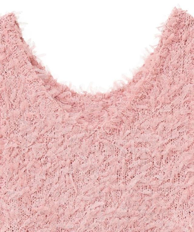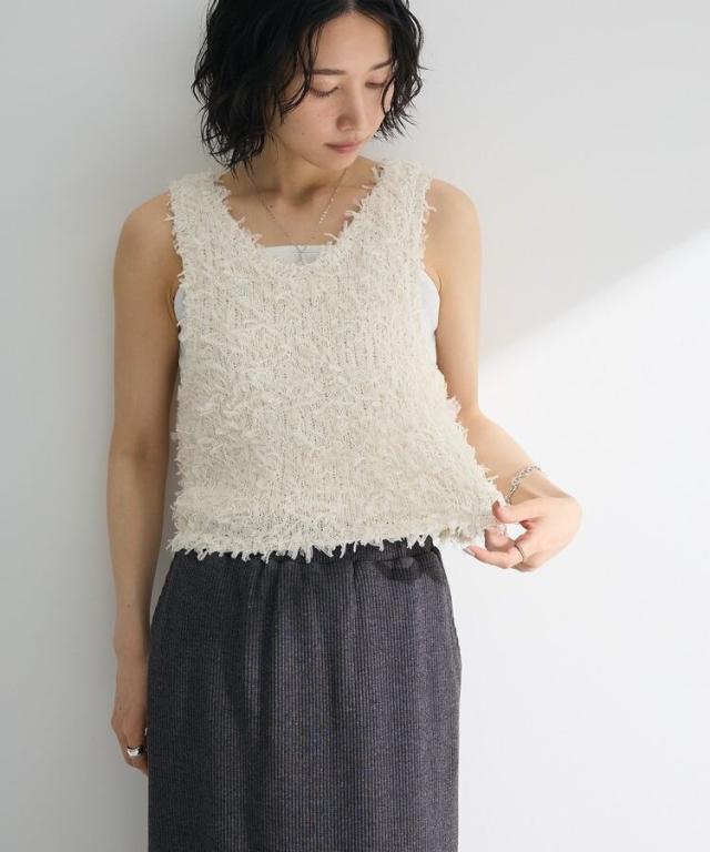 ふわふわとした表情豊かなチュールヤーン素材で仕立てたベスト。ソフトな肌触りで伸縮性に優れ、インナーと合わせてももたつかず快適に着こなせます。前後どちらを前にしても着用できる2WAY仕様なのも嬉しいポイント。まだ暑い時期から秋らしい着こなしもお楽しみいただけるおすすめのアイテムです。透け感[ややあり]