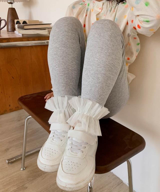 裾にたっぷりとあしらわれたチュールフリルが、足元にボリュームを与えつつ、女の子らしさをグッと引き立てます。柔らかいスウェット風生地でストレッチ性も抜群◎